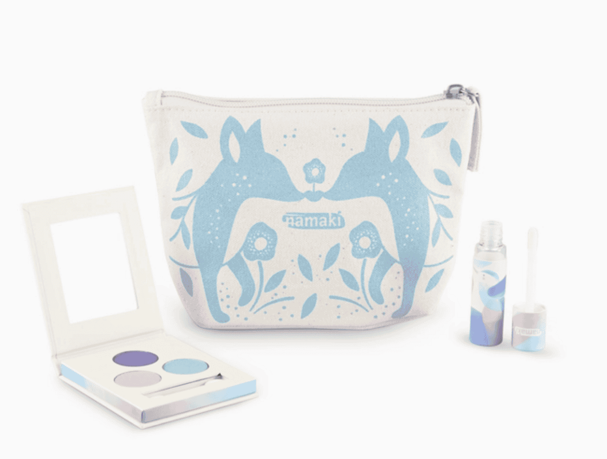 This kit contains a real concentrate of freshness and magic: a 3-color eyeshadow palette and a moisturizing pink glitter gloss, both certified organic, for a gentle makeup. Practical and eco-friendly, the case is made of organic cotton, with an adorable screen-printed illustration. A gift idea as pretty as it is committed!
