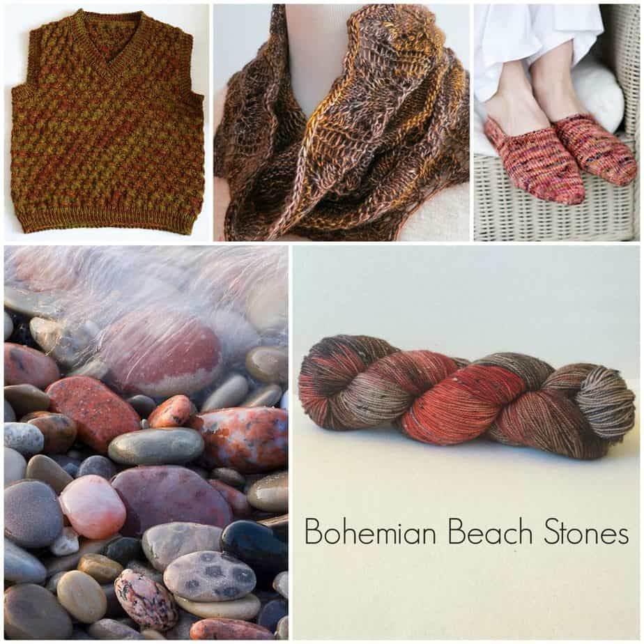 Bohemian Beach Stones is our September feature for the Sleeping Bear Yarn Club. This tweedy, variegated yarn in browns and orangey-reds is the perfect colorway to usher in Fall. Dyed exclusively for our members by April of Phoenix Fiber Co. in Ohio, each skein has 438 yds (100g) and is comprised of 85% superwash Merino wool and 15% nylon nep.