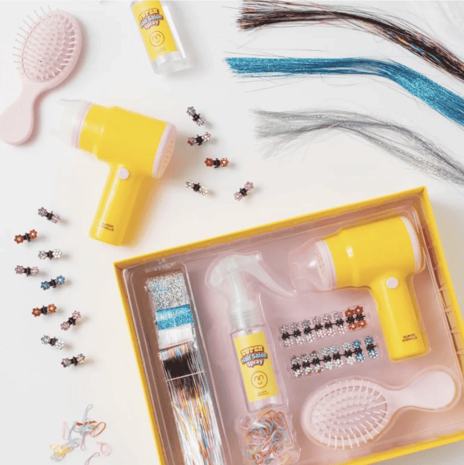 Unleash your inner hairstylist with the Hairstyle Hero Hair Salon Kit! Featuring mini elastics and gem flower clips for versatile styling options, a detangling brush to effortlessly tame your locks, a super hair dryer that lights up and lightly blows air, a spray bottle for quick touch-ups and clip-in hair tinsel for added glam, this kit has everything you need to open your very own at-home hair salon! It’s not just a Hairstyle Kit—it’s an invitation to explore, experiment, and let your imagination soar!