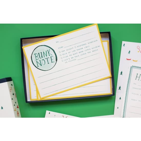 Tuck it in with the sleeping bag and extra chocolates, before your darling boards the bus. Box includes: four unique letterhead sheets, four Bunk Notes and four envelopes.