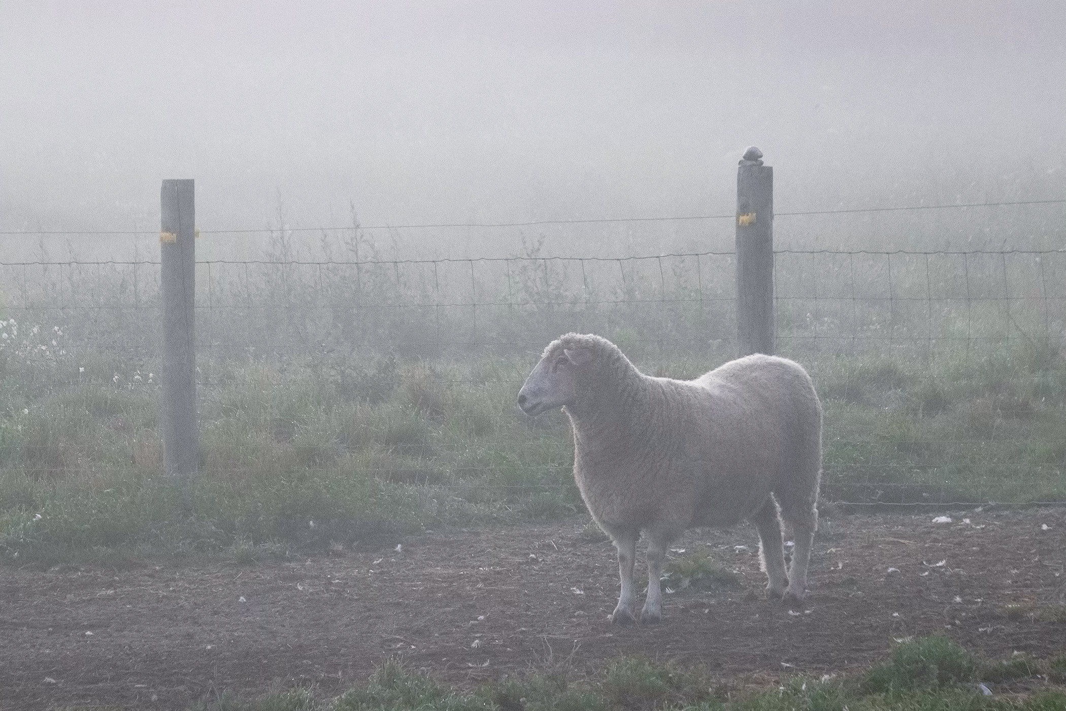 Just after sunrise, the field softens. Pale green leans into soil, the air still carries the weight of dew, and Nova moves through it all—quiet, steady, familiar. Nova’s Field holds that moment in color: a gentle earth-toned green touched with the warmth of wool and weather.