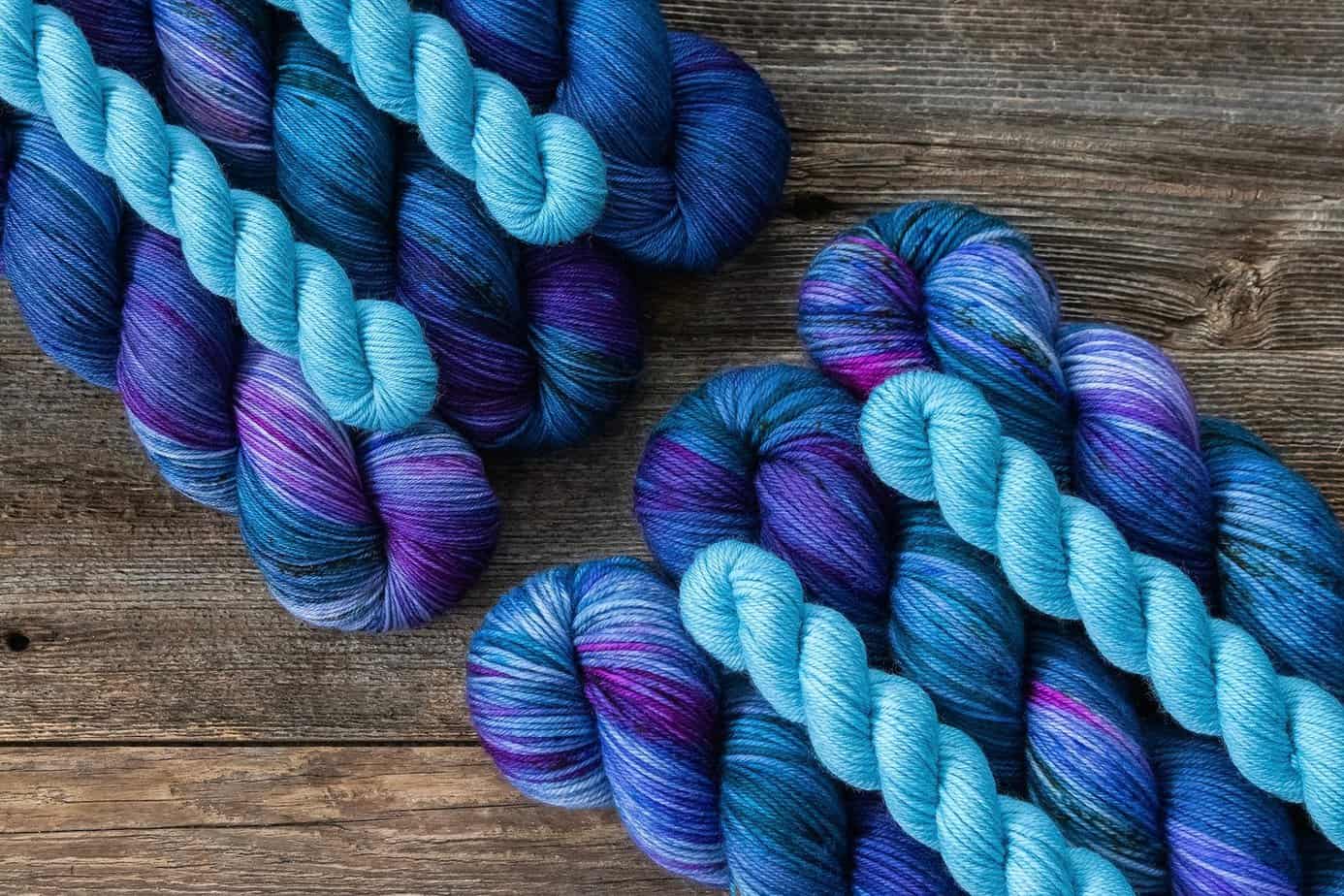 Dyed for us by the talented Nicole of Hue Loco in Colorado. Rich blue depths meet the shimmer of teal, softened by sky blue, with quiet drifts of purple and sudden flashes of magenta—like sunlight catching the lake’s surface at just the right angle. Hush that comes as you slip across calm water, or simply stand on shore and watch a boat cut a gentle line through the bay. A colorway made for slow afternoons and easy stitches, where breath and breeze feel equally steady.