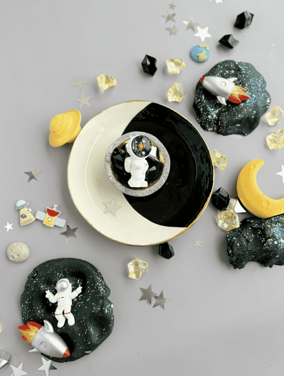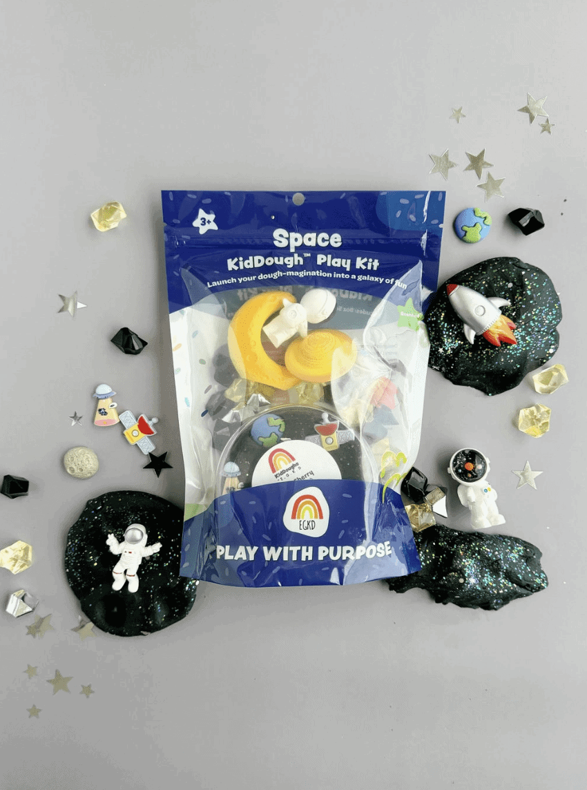 Includes: 8 oz Black (Black Cherry) KidDough with Space Glitter and Space Charms (Earth, Moon, Satellite, Astronaut, UFO), Astronaut Figurine, Planet Figurine, Crescent Moon Figurine, Rocket Figurine, Yellow, Silver and Black Acrylic Space Rocks