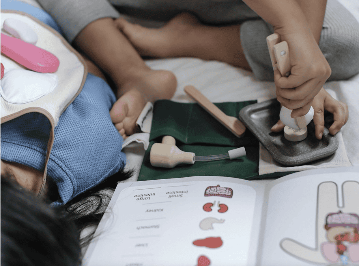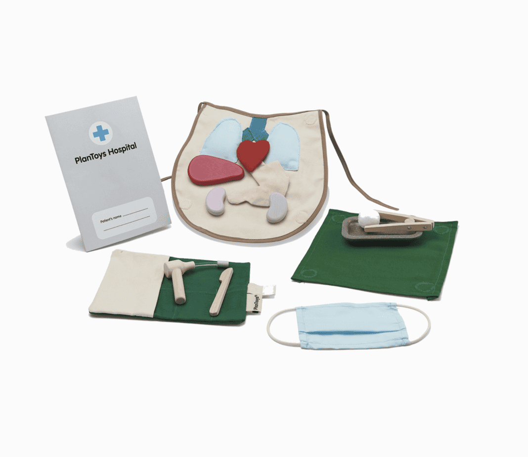 Role play as a surgeon and learn about the human body with the PlanToys Surgeon Play Set. This playset includes a fabric piece labeled with different organs (the bronchus, lungs, heart with a beep button, stomach with a piece of food inside, liver and kidneys) and personalized patient’s card with vocabulary inside that can be used for realistic pretend-play with dolls and stuffed friends. There is also a storage bag to house the included medical equipment (a scalpel, forceps, cotton buds, surgical drape, medical mask, suction device and PlanWood™ tray). Develop fine motor skills, logical thinking and problem solving skills, hand-eye coordination and more with this unique kit!
