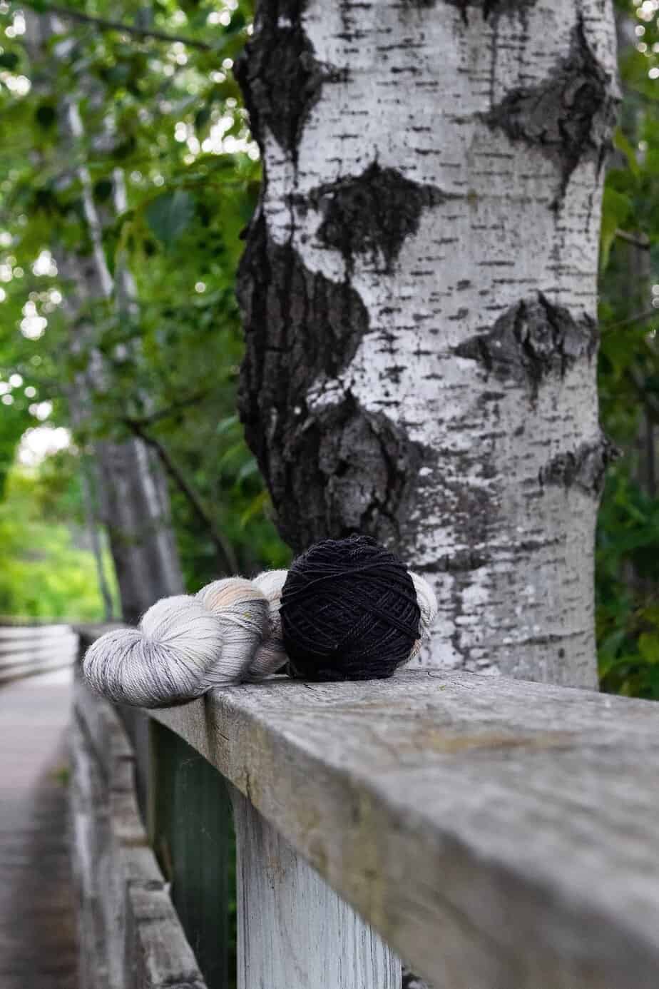 Dyed for us by the talented Chandi of Expression Fiber Arts in Charlotte, North Carolina. This colorway is a blend of neutral cream, taupe and grays inspired by the wood of the trees and the boardwalk. The accent mini is a deep charcoal gray reminiscent of the rich blacks of a birch or the dark wet forest floor. The glorious summer season of trail hikes is here.