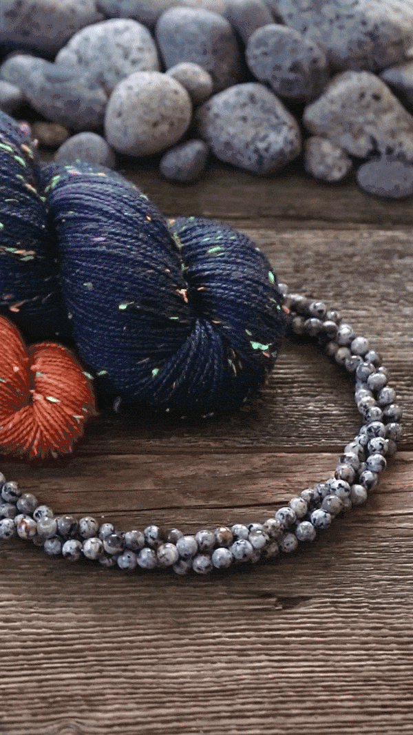 We are thrilled to announce the June installment of the Sleeping Bear Yarn Club: Yooperlite. Dyed for us by the talented Hannah of Circus Tonic Handmades in Australia. This colorway is a charcoal rich shade of night with a glowing deep orange mini. This tweed has a secret hidden in plain sight – it’s fluorescent! Yooperlite, as it’s best known to us, is a fluorescent sodalite stone here in Michigan and primarily found in the Upper Peninsula. BUT, they have been found here in our area. Some have been found by Pointe Betsy and even some on Van’s Beach. Now, we haven’t found Yooperlite ourselves on our local beach’s nor have we given it the old college try. We are eager to do some night rock hunting and we’ll share our spoils when it happens. And you too – keep us posted when you find this elusive glowing stone on this side of the bridge.